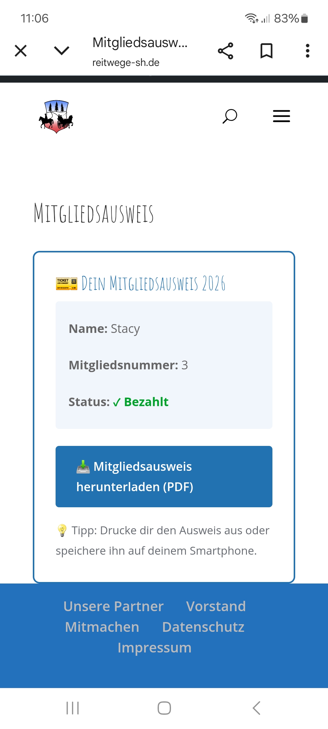 wir waren für euch fleißig und haben die Erstellung der Mitgliedsausweise optimiert. Geht hierzu auf www.reitwege-sh.de in euren Mitgiederbereich, klickt auf Mitgliedsausweise und ladet euch den aktuellen Ausweis einfach herunter. Den aktuellen Ausweis erhaltet ihr nach Zahlungseingang für das jeweilige Beitragsjahr 🪪